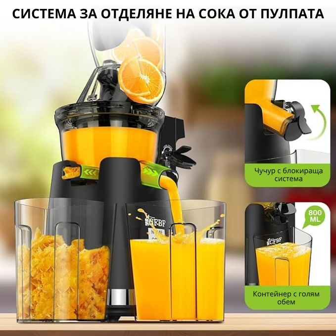 Изработена от здрави материали без BPA, сокоизстисквачката предлага чисти и безопасни сокове за цялото семейство. С капацитет от 2 литра и здрава конструкция с тегло 6 паунда (2,72 кг), тя е идеална за ежедневна употреба. Включва 2 години гаранция и 30 дни за тестване, за да се наслаждаваш на пълно, здравословно и безкомпромисно изживяване.